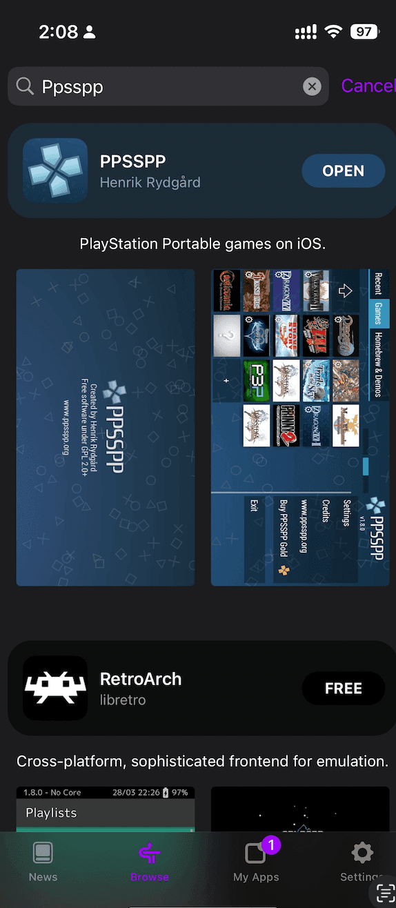 Click on Done in the top right corner, and go back to Browse. You should be able to see a list of apps. In the search bar, search for “PPSSPP” and install it.